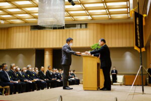 第2部「式典」では、開会儀礼に続いて丹治庁長が挨拶、続いて功労者表彰では34名の神職・役員総代らの長年に亙る功績を表彰した。