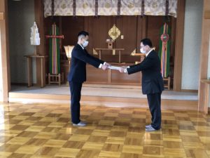 神職任用辞令交付式 月別 選択してください 2025年11月 2025年10月 2025年8月 2025年7月 2025年6月 2025年5月 2025年4月 2025年3月 2025年2月 2025年1月 2024年10月 2024年9月 2024年8月 2024年7月 2024年6月 2024年3月 2024年2月 2023年12月 2023年11月 2023年10月 2023年9月 2023年8月 2023年7月 2023年6月 2023年5月 2023年4月 2023年3月 2023年2月 2023年1月 2022年11月 2022年10月 2022年9月 2022年8月 2022年7月 2022年6月 2022年5月 2022年4月 2022年3月 2021年10月 2021年9月 2021年8月 2021年7月 2021年6月 2021年5月 2021年4月 2021年3月 2021年2月 2020年11月 2020年10月 2020年9月 2020年8月 2020年7月 2020年6月 2020年5月 2020年4月 2020年3月 2020年2月 2020年1月 2019年11月 2019年9月 2019年8月 2019年2月 2019年1月 2018年9月 2018年8月 カテゴリー別 選択して下さい 神社庁報 2022年3月30日 3月29日10時30分より神職任用辞令交付式が、福島県神社庁2階神殿にて行われました。 3月20日付にて任用された三吉神社権禰宜・吉田佑亮氏、同神社宮司・松浦知弘氏参列のもと、丹治正博庁長より吉田佑亮氏へ辞令が伝達されました。 « 前の記事へ 次の記事へ »