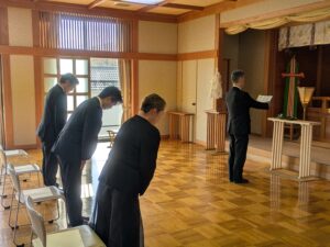 神職身分二級證書伝達式 月別 選択してください 2025年11月 2025年10月 2025年8月 2025年7月 2025年6月 2025年5月 2025年4月 2025年3月 2025年2月 2025年1月 2024年10月 2024年9月 2024年8月 2024年7月 2024年6月 2024年3月 2024年2月 2023年12月 2023年11月 2023年10月 2023年9月 2023年8月 2023年7月 2023年6月 2023年5月 2023年4月 2023年3月 2023年2月 2023年1月 2022年11月 2022年10月 2022年9月 2022年8月 2022年7月 2022年6月 2022年5月 2022年4月 2022年3月 2021年10月 2021年9月 2021年8月 2021年7月 2021年6月 2021年5月 2021年4月 2021年3月 2021年2月 2020年11月 2020年10月 2020年9月 2020年8月 2020年7月 2020年6月 2020年5月 2020年4月 2020年3月 2020年2月 2020年1月 2019年11月 2019年9月 2019年8月 2019年2月 2019年1月 2018年9月 2018年8月 カテゴリー別 選択して下さい 2025年11月17日 11月14日午前11時30分より神社庁神殿において、昇級神職4名と各奉仕神社役員参列のもと、神職身分二級證書伝達式が執行されました。 11月1日付にて、5名の神職が二級神職となりました。 丹治庁長より身分證書が伝達された後、昇級神職を代表して三光稲荷神社・大竹光二宮司によって誓いのことばが奏上されました。 « 前の記事へ
